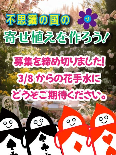 不思議の国の寄せ植えを作ろう! 2025/2/4 お知らせ “鹿島田に春が来た!”でおなじみのかしまだイースターですが、 春の「かしまだ花手水」開催に先立ちまして、 花手水と一緒に展示する、春の寄せ植えを 鹿島田商店会と作っていただける方を募集いたします。 春の花手水のテーマは「不思議の国の花手水Ⅱ」となっております。 ご参加を心よりお待ちしております。 ※ご参加を締め切りました。3/8からの花手水にどうぞご期待ください。 ▲2023年のかしまだイースター「不思議の国の花手水」