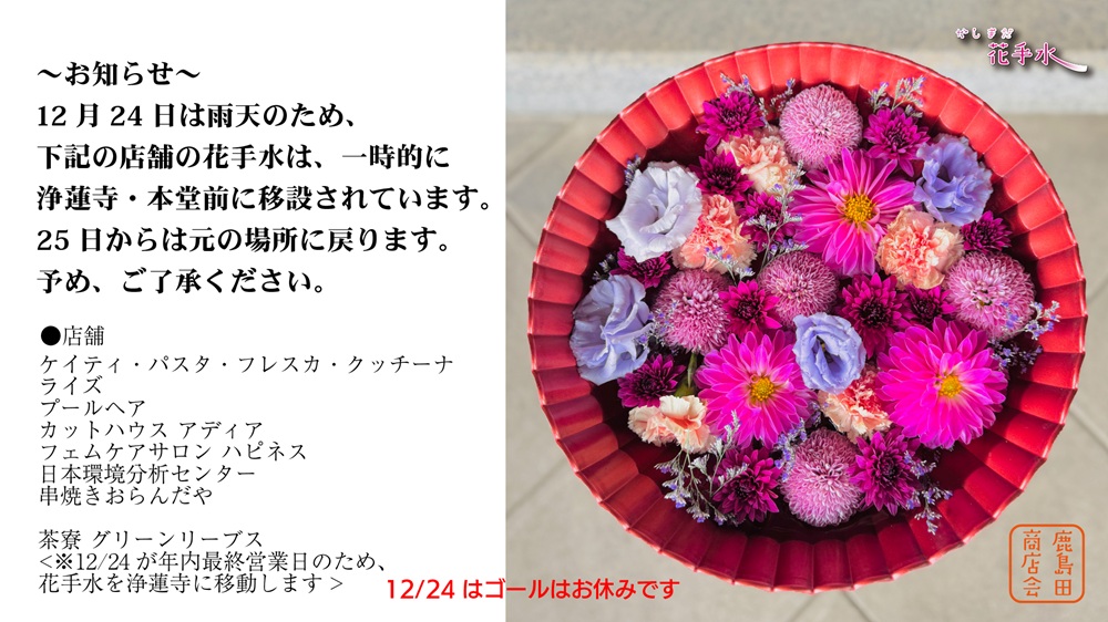 かしまだ花手水よりお知らせです 12/24 2025/12/24 お知らせ ~お知らせ~ 12月24日は雨天のため、 下記の店舗の花手水は、一時的に浄蓮寺・本堂前に移設されています。 25日からは元の場所に戻ります。予め、ご了承ください。 ケイティ・パスタ・フレスカ・クッチーナ ライズ プールヘア カットハウス アディア フェムケアサロン ハピネス 日本環境分析センター 串焼きおらんだや 茶寮 グリーンリーブス <※12/24が年内最終営業日のため、 花手水を浄蓮寺に移動します> 尚、12/24はゴールはお休みです。