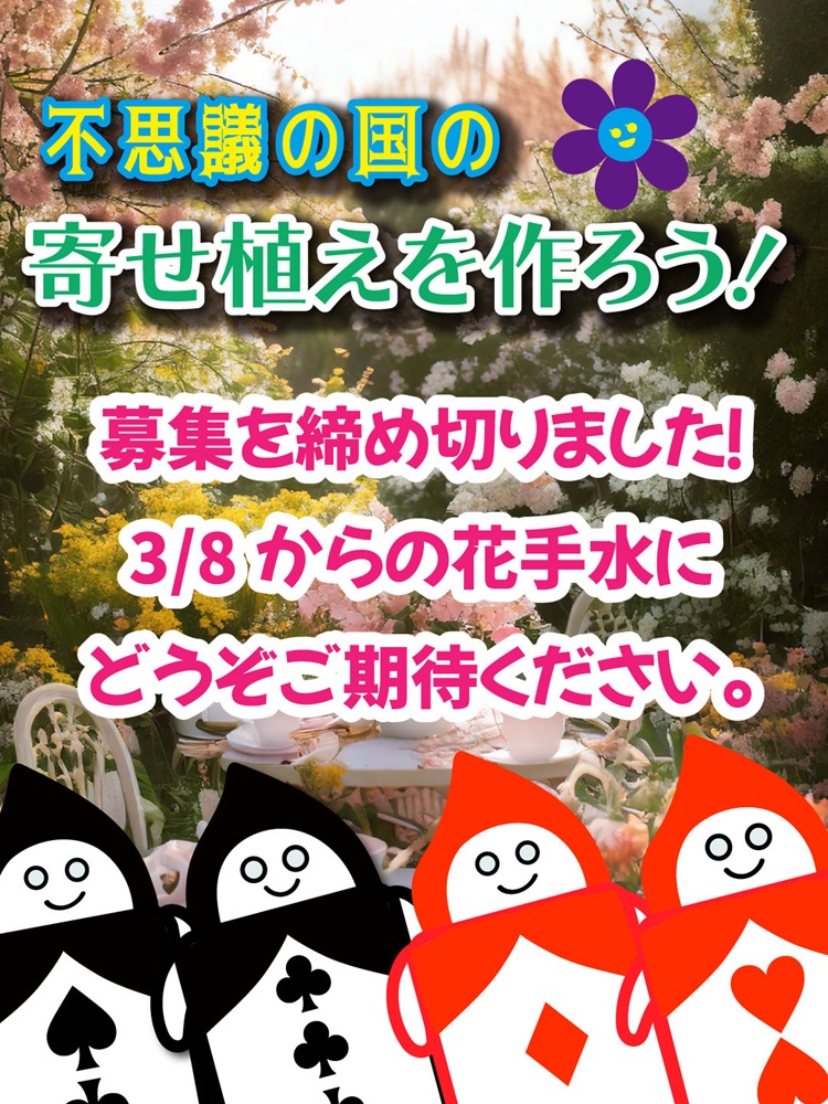 2/24開催・不思議の国の寄せ植えを作ろう!応募フォーム 2025/2/3 返信が無い等、お困りの点やご不明な点がございましたら、 044-544-7771までご連絡ください (※問い合わせ時間・・・12:00~17:00 水曜日以外の受付となります) 開催日:2025年2月24日(月・祝) 時間:14:00~ (所要時間・・・開始から2時間以内に終了予定) 場所:JR南武線・鹿島田駅周辺スペース(室内で実施) 持ち物:軍手、汚れてもよい服 予約制・先着順となっております。 ご参加を締め切りました。 ※3/8からの花手水にどうぞご期待ください。